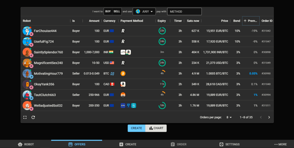 The Offers tab on the bottom menu will display all of the available offers created by other users. It shows the premium (which may sometimes even be negative) compared to the spot price, as well as the size of the bond you will have to commit to enter the trade. You can set up some filters to narrow down your search by currency and payment method.