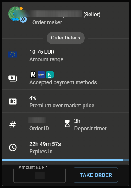 Once you click an offer you will be able to review all the details. Click Take order to proceed with the trade.