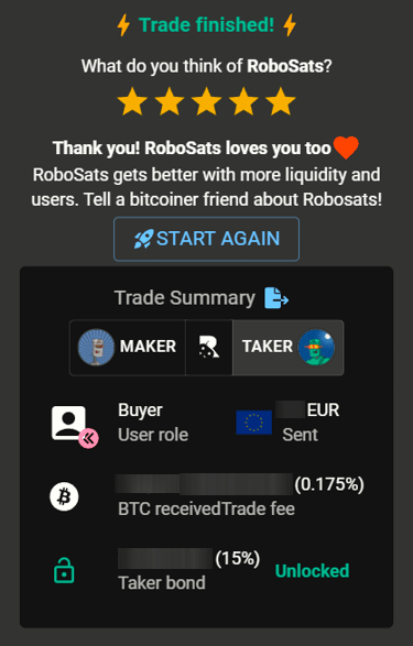 Visit learn.robosats.com for more information, and make sure you understand how to use the platform before entering a trade.