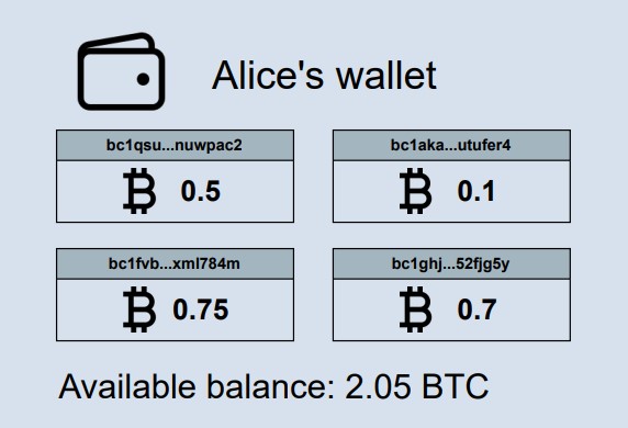 In this example, Alice’s wallet contains 4 different UTXOs for a total balance of 2.05 BTC.