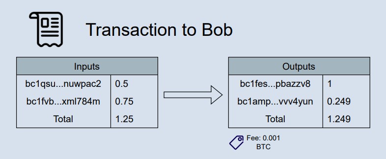 Alice wishes to send 1 BTC to Bob. Her wallet picks 2 UTXOs for a sufficient amount, and uses them in a transaction that creates 2 outputs: one pays Bob his 1 BTC, and the other one goes to a ‘change address’ generated by Alice’s wallet.